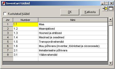 salvestatakse aknas "Inventari tüübid" tehtud