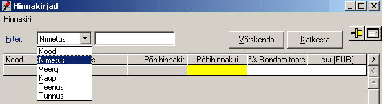 Sorteeri - võimaldab sorteerida hinnakirjas olevaid kaupu/teenuseid järgmiste parameetrite järgi:
