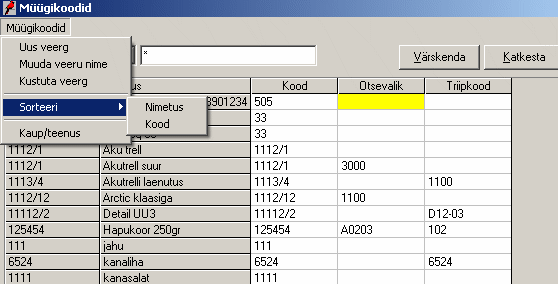 Vaikimisi järjestatakse kaubad nimetuse järgi. On võimalik järjestada ka koodi järgi, kuid see kehtib vaid põhikoodi veeru kohta. Koodi järgi järjestamiseks tuleb teha menüüvalik: Müügikoodid -> Sorteeri -> Kood.