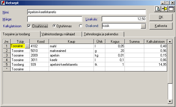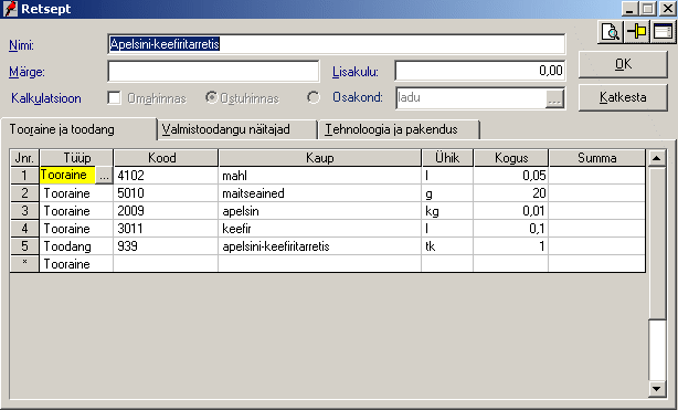 Sellel lehel määratakse ära retsepti koostisosad: materjalid, mis tootmisesse lähevad ja toodang, mis nendest materjalidest saadakse. Täitmiseks on veerud: