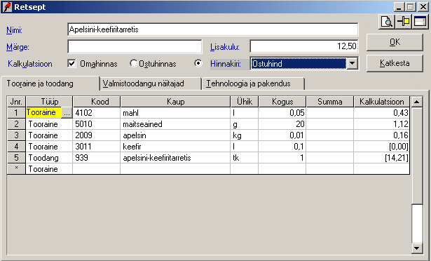 Ostuhinnas - kalkulatsiooni leidmiseks kasutatakse defineeritud hinnakirja; hinnakirja määramiseks tekib selle lipu püsti panemisel täiendav lahter "Hinnakiri"; siin määratud hinnakirja ei salvestata retsepti salvestamisel, see on vaid võimalus toote omahinna vaatamiseks hinnakirja hindades