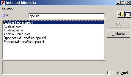 sisestamiseks (pole kohustuslik); näidatakse välja retsepti kiirotsijas