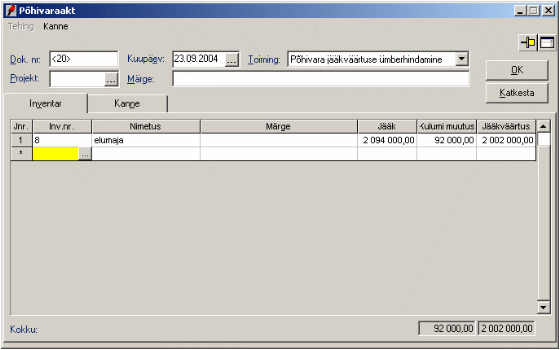 täidetakse programmi poolt lahtrid "Jääk" ja "Jääkväärtus"