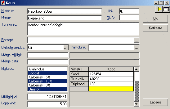 Lehel kuvatakse ja siin saab sisestada kõiki kauba koode erinevates kooditabelites: