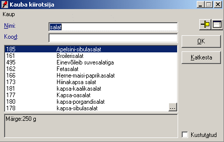 Aknal “Kaupade kiirotsija” on kaks nuppu “OK” ja “Katkesta” ning valik “Kustutatud”. Vajutades nuppudele “OK” või “Katkesta” suletakse kiirotsija aken. Valides valiku “Kustutatud” näidatakse otsingu tulemuste aknasse ka filtritingimustele vastavaid kustutatud kaupu.