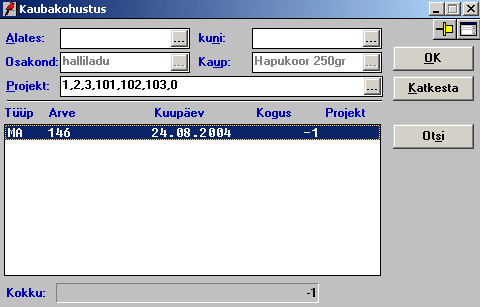 Aknasse kuvatakse kõik väljastatud arved, millel puuduvad saatelehed (kaup on väljastamata). Loetelus esitatav info on: dokumendi tüüp, number, kuupäev, kauba kogus dokumendil ja dokumendi projekt.