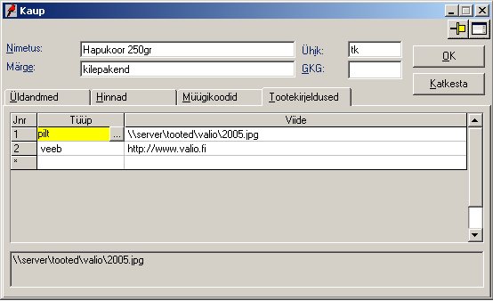 Lehel sisestatakse/kuvatakse kaupa kirjeldavad viited. Viide võib juhatada veebilehele, serveris asuvale failile, jne. Viite tüübid defineeritakse kasutaja enda poolt. Saab seda teha veerust "Tüüp" avaneva kiirotsija "Tootekirjelduste tüübid" abil, või registrite menüüst: Registrid -> Kaubad/teenused -> Tootekirjeldused.