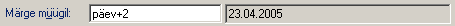 Näide: Kui lahtrisse on sisestatud valem "päev+2" ja arve kuupäevaks on 21.04.05, siis arvele trükitakse (23.04.05):