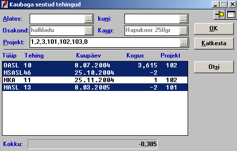 • Avades hüpikmenüüst valiku "Tehingud" avaneb aken "Kaubaga seotud tehingud":