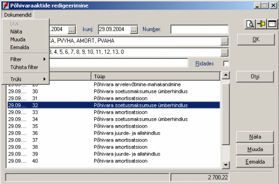 - Tüüp - põhivara toimingute tüübid, mida