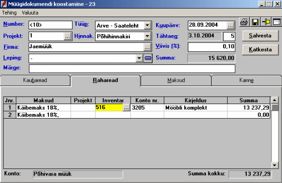 - lahtris "Inventar" määratakse müüdav põhivaraobjekt