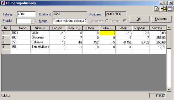Toiming on mõeldud ostutellimuse koostamiseks lähtudes kauba vajadusest laos. Kauba vajaduse leidmisel saab arvestada mitmete erinevate parameetritega: laoseisuga konkreetsel kuupäeval, kaubakohustusega, kauba tellimustega, eelmiste perioodide müügikäibega.