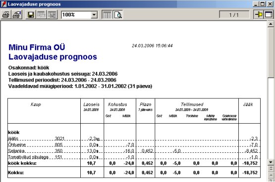 Tabelis esitatavat informatsiooni on võimalik saada ka väljatrükina paberkujul. Selleks tuleb vajutada akna üleval paremal nurgas asuvale ikoonile . Ekraanile kuvatakse aruanne "Laovajaduse prognoos".
